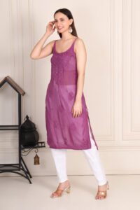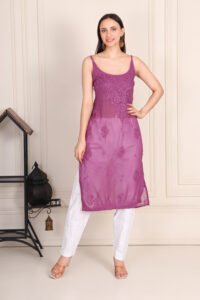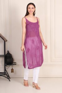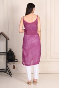 Current price is: ₹1 Exquisite Lakhnawi Sleeveless Kurti in Satin Silk to adore your wardrobe. Available in 38, 40, 42, 44, 46 sizes.