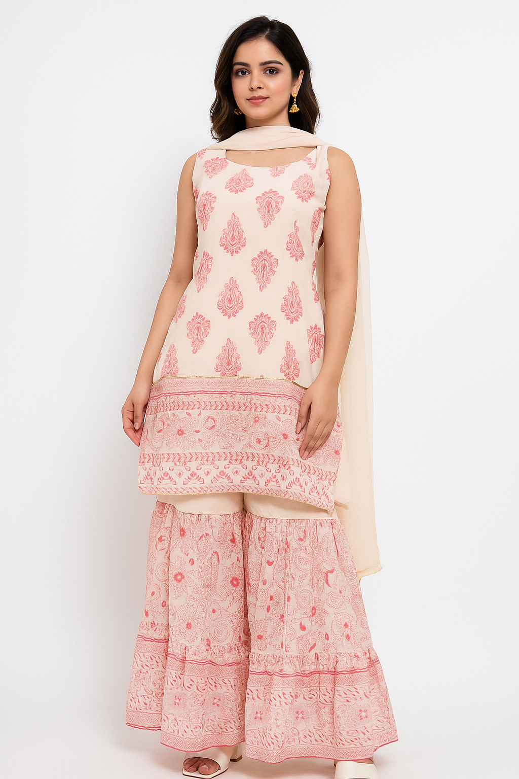 ethnic motifs embroidered round neck sequinned kurta with sharara $ dupatta Sharara sui