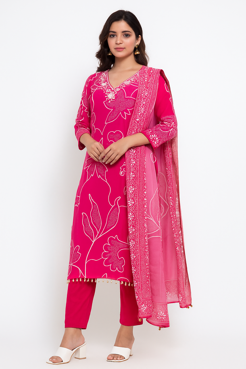 pure crepe suit motifs embroidered sequinned kurta with pants ,dupatta  V neck size M,L,XL,XXL,
